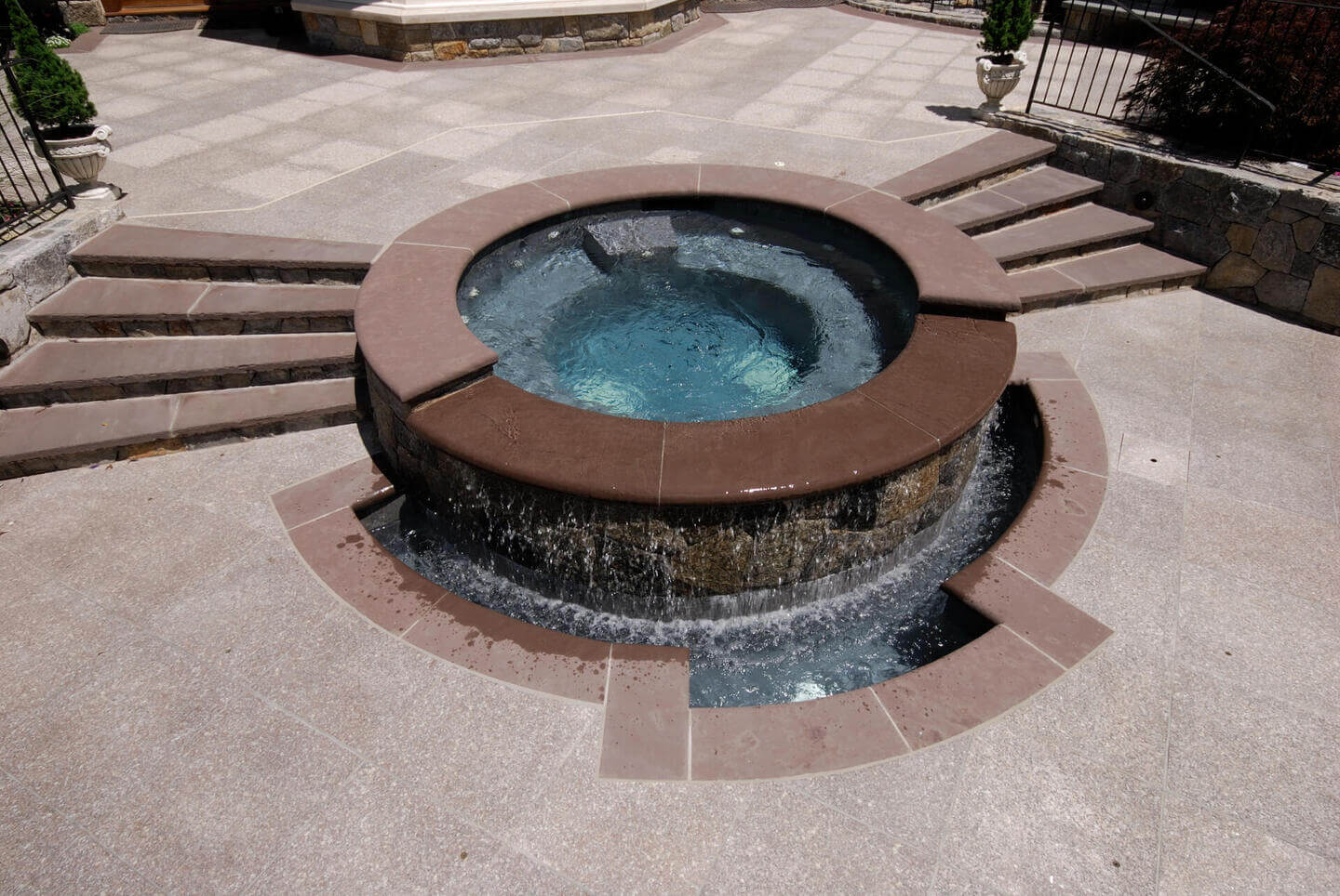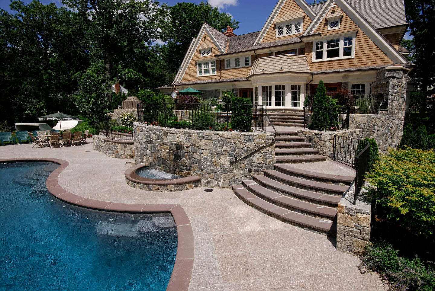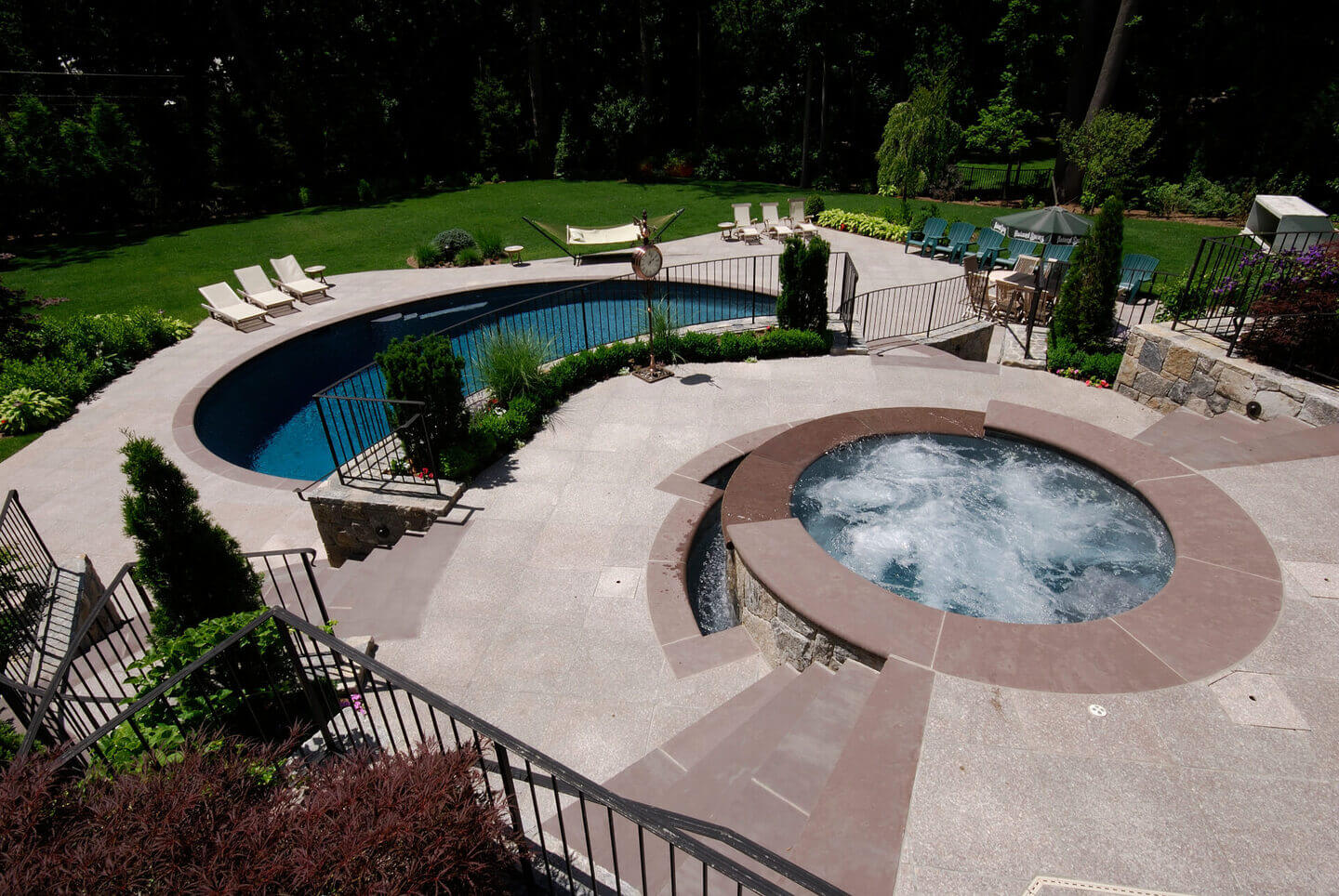 The moment you step into this secluded sanctuary, you’re greeted by a striking sense of symmetry and serenity. Crisp lines and tiered landscaping frame a luminous pool that becomes the heart of the outdoor living space. Elegant stonework guides the eye toward a raised spa that flows gently into the water below, creating a calming rhythm that mirrors the peaceful ambiance of the surrounding greenery. Every element, from the geometric layout to the curated plantings, was carefully chosen to harmonize with the natural setting and elevate the experience of modern pool design. At dusk, soft lighting transforms the space into a glowing retreat perfect for quiet evenings or sophisticated entertaining. With a refined balance of beauty and function, Shoreline Pools delivers a vision that exemplifies the artistry of a truly exceptional custom pool builder. This award-winning oasis is another example of how Shoreline Pools brings dream outdoor environments to life.