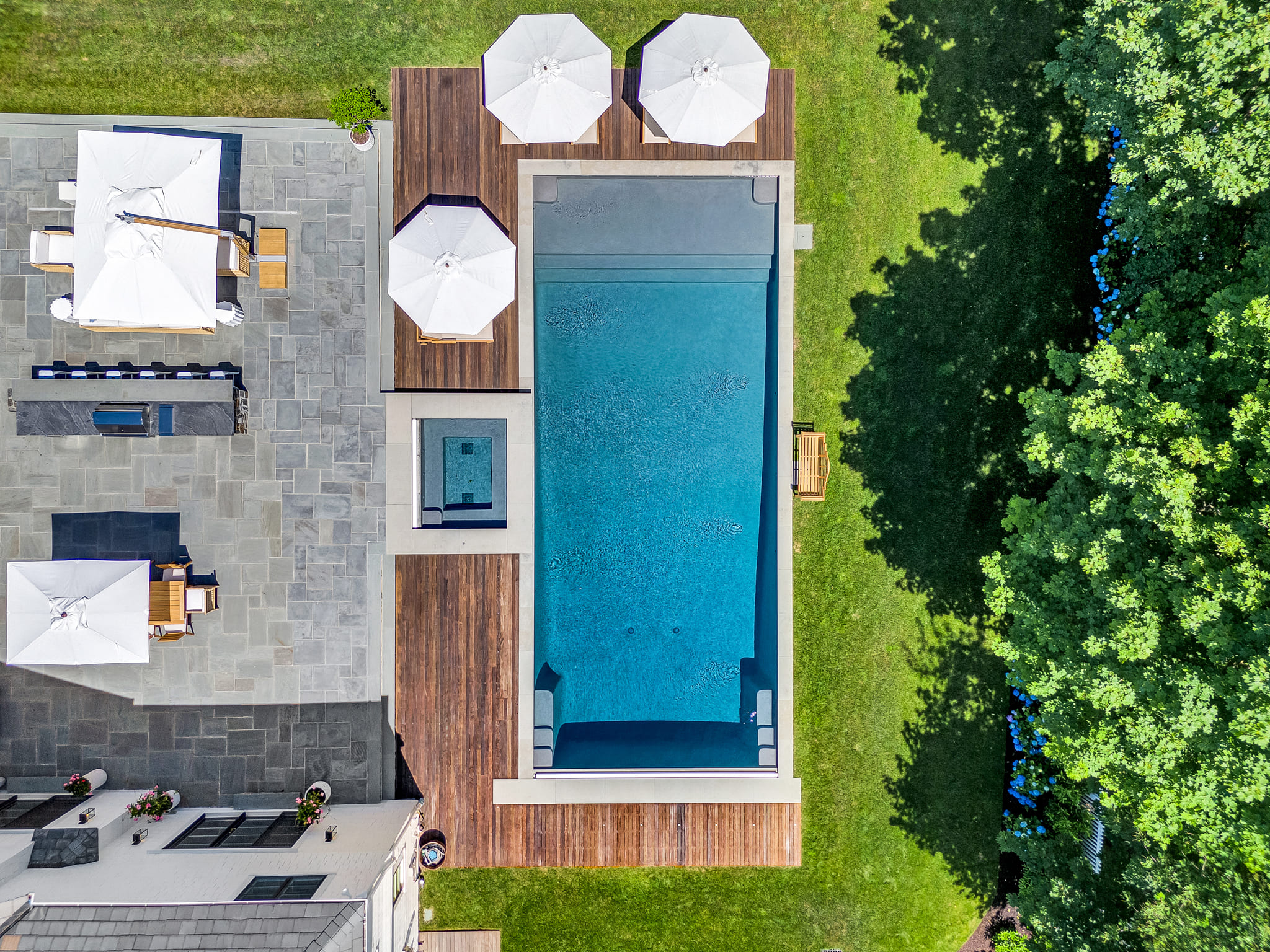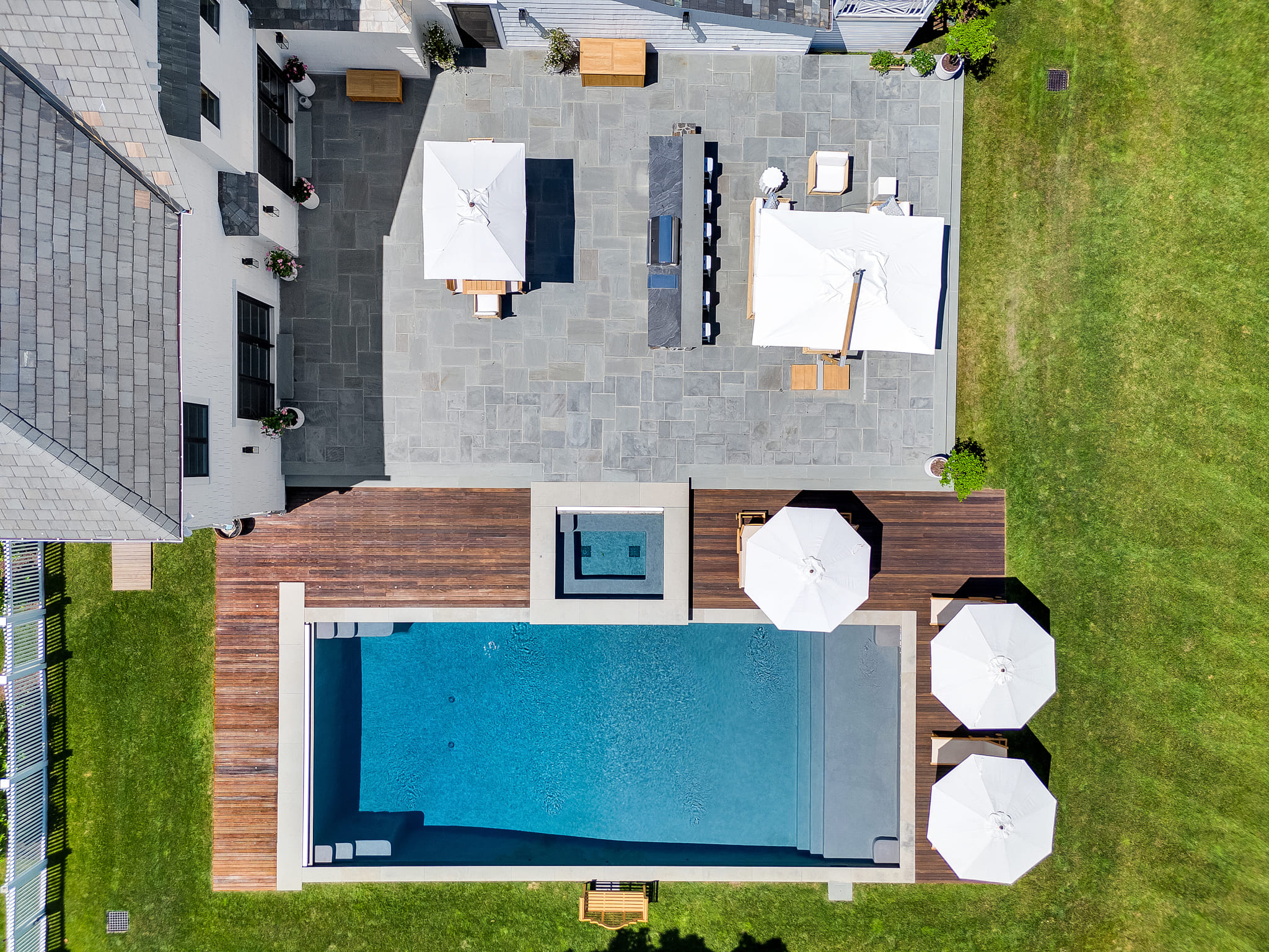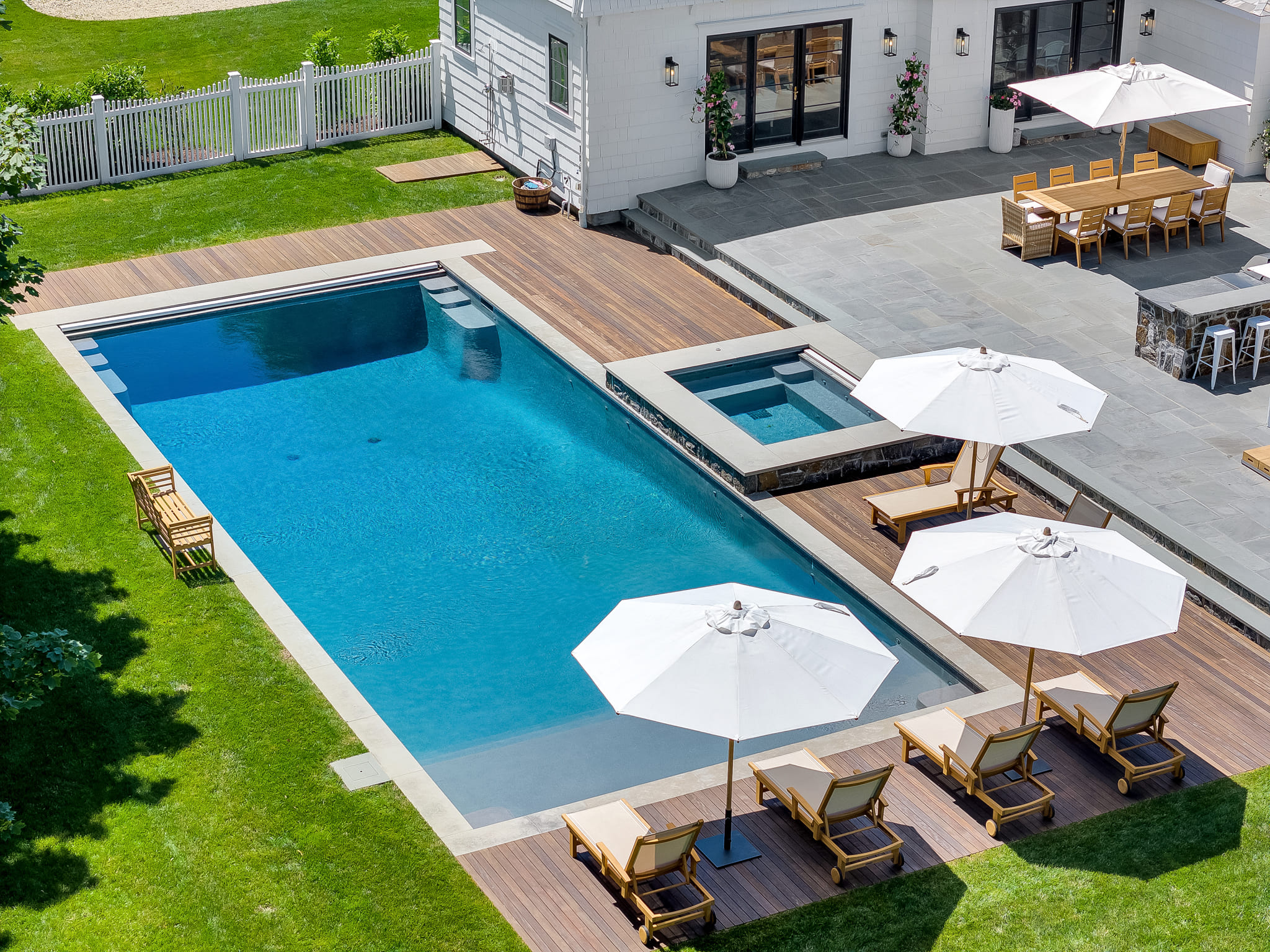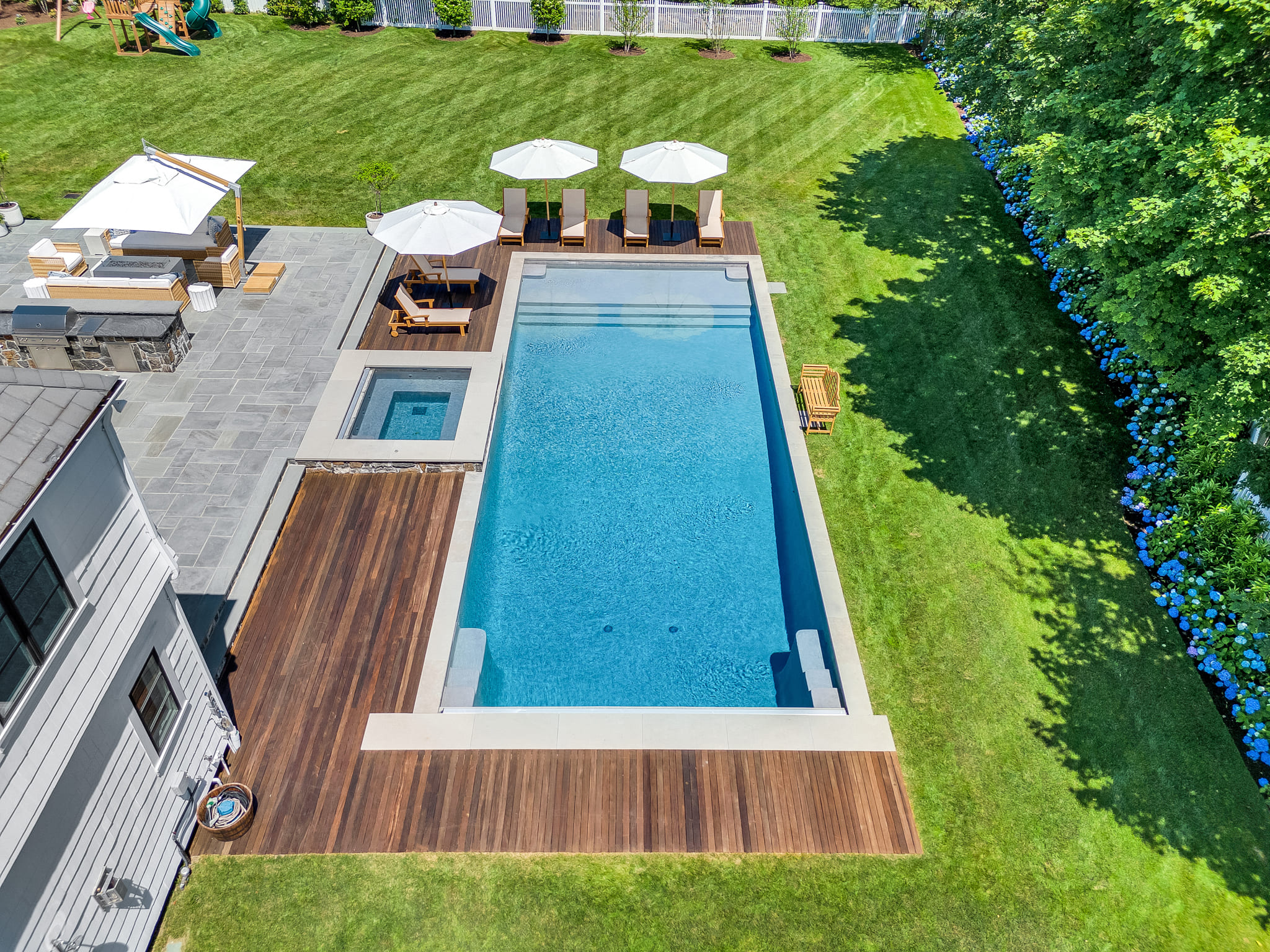 Surrounded by lush green lawn and open waterfront views, this modern pool design transforms the backyard into a serene escape. Crisp lines and a generous swimming lane strike a perfect balance between recreation and relaxation, while the spa offers a private corner for peaceful indulgence. Expansive stone terraces flow into warm wood decking, creating multiple destinations for lounging under the sun or gathering for evening cocktails. Sleek umbrellas and refined furnishings enhance the coastal atmosphere, making the setting ideal for both lively celebrations and quiet moments. Shoreline Pools, a renowned custom pool builder, has shaped an outdoor living space where every detail feels purposeful, from the water’s edge to the placement of each chair. With Shoreline Pools’ expertise, this home now enjoys a setting that inspires connection, comfort, and the simple joy of time spent by the water.