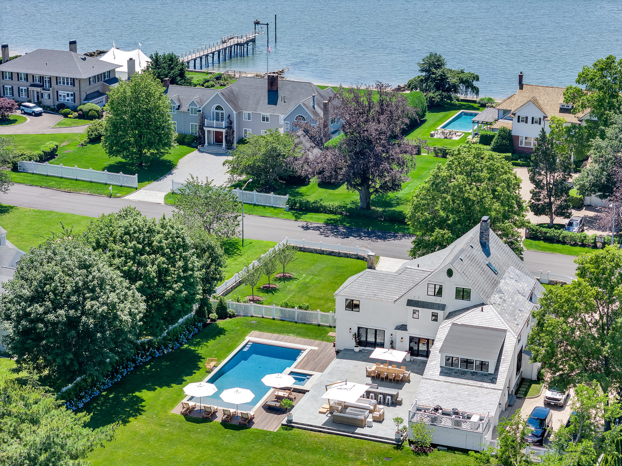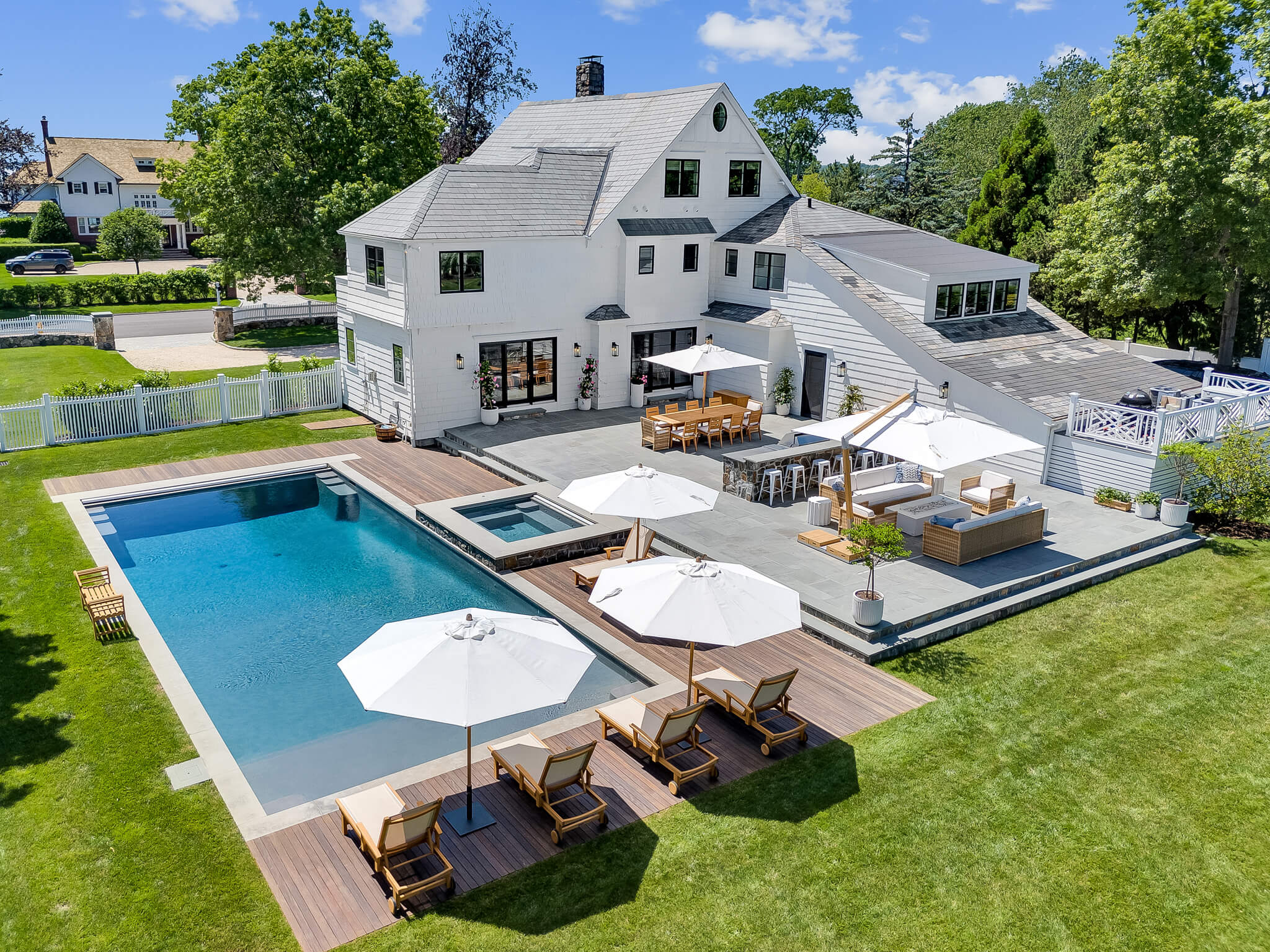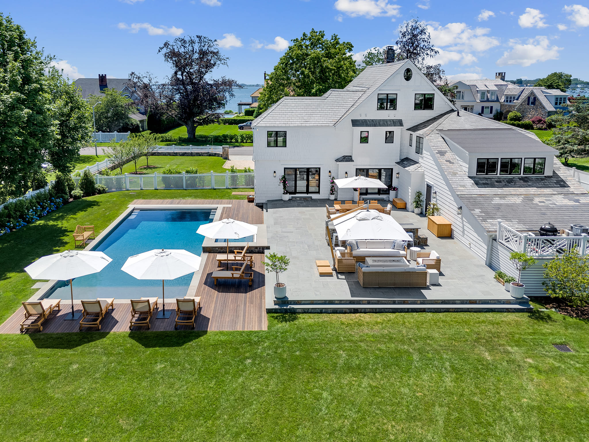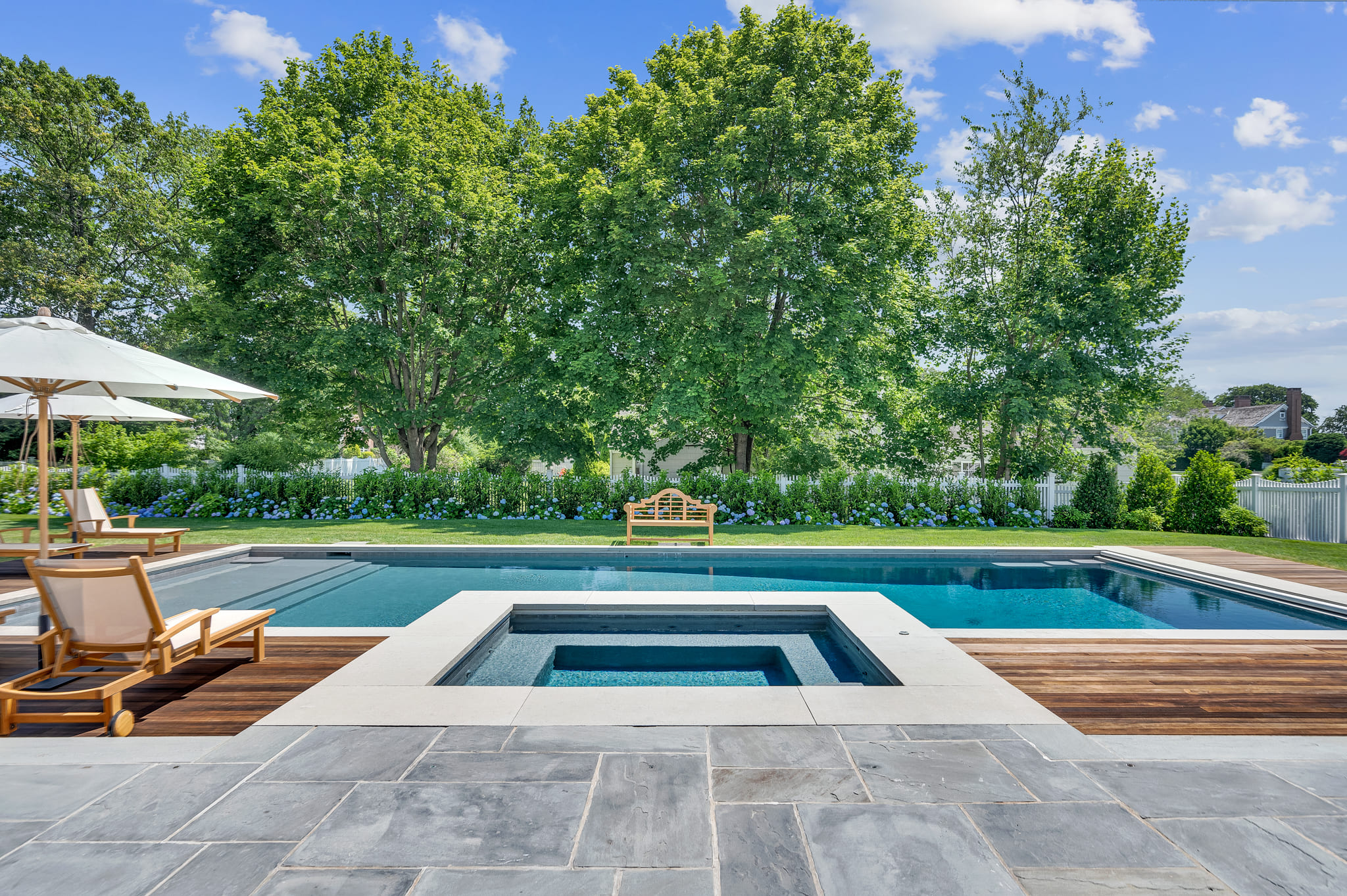 Surrounded by lush green lawn and open waterfront views, this modern pool design transforms the backyard into a serene escape. Crisp lines and a generous swimming lane strike a perfect balance between recreation and relaxation, while the spa offers a private corner for peaceful indulgence. Expansive stone terraces flow into warm wood decking, creating multiple destinations for lounging under the sun or gathering for evening cocktails. Sleek umbrellas and refined furnishings enhance the coastal atmosphere, making the setting ideal for both lively celebrations and quiet moments. Shoreline Pools, a renowned custom pool builder, has shaped an outdoor living space where every detail feels purposeful, from the water’s edge to the placement of each chair. With Shoreline Pools’ expertise, this home now enjoys a setting that inspires connection, comfort, and the simple joy of time spent by the water.