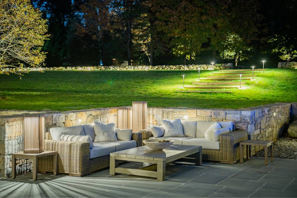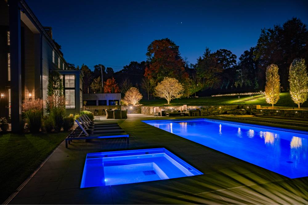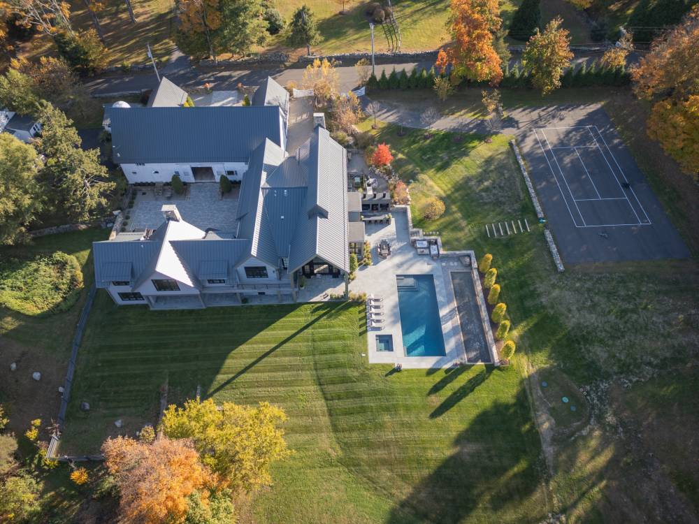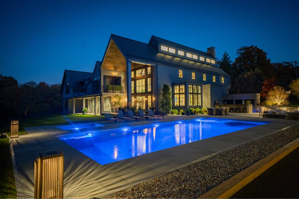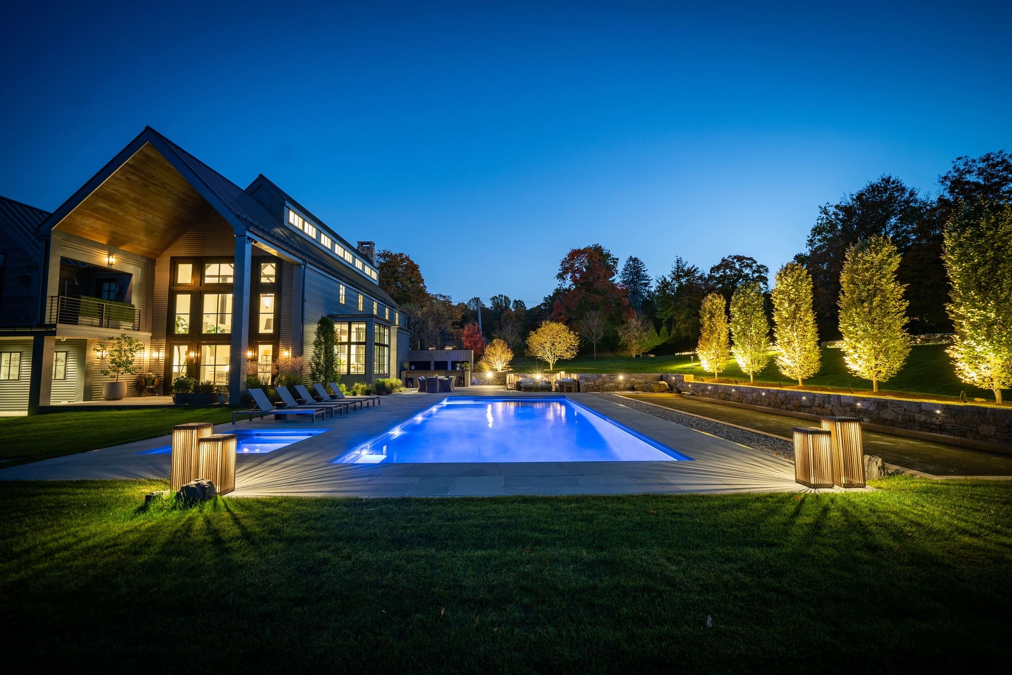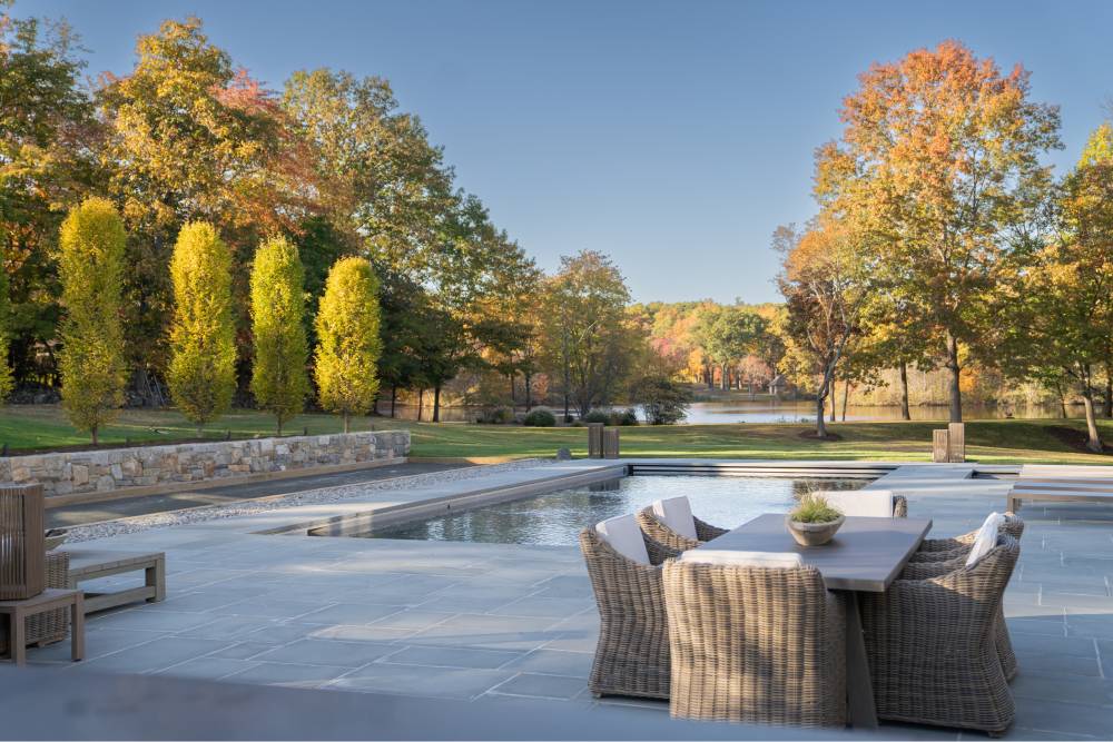 The sleek, rectangular pool extends from rear of house toward the scenic, private pond. A separate, year-round spa allows the space to be utilized throughout every season. The outdoor kitchen with seating bar extends the indoor entertaining space outdoors to better maximize the bucolic setting and view. The stone retaining walls serve to separate and define the newly created space from the balance of the property and its rolling slopes and hills. A custom bocce court runs parallel to the pool enhancing adds an element of fun when entertaining friends and family.