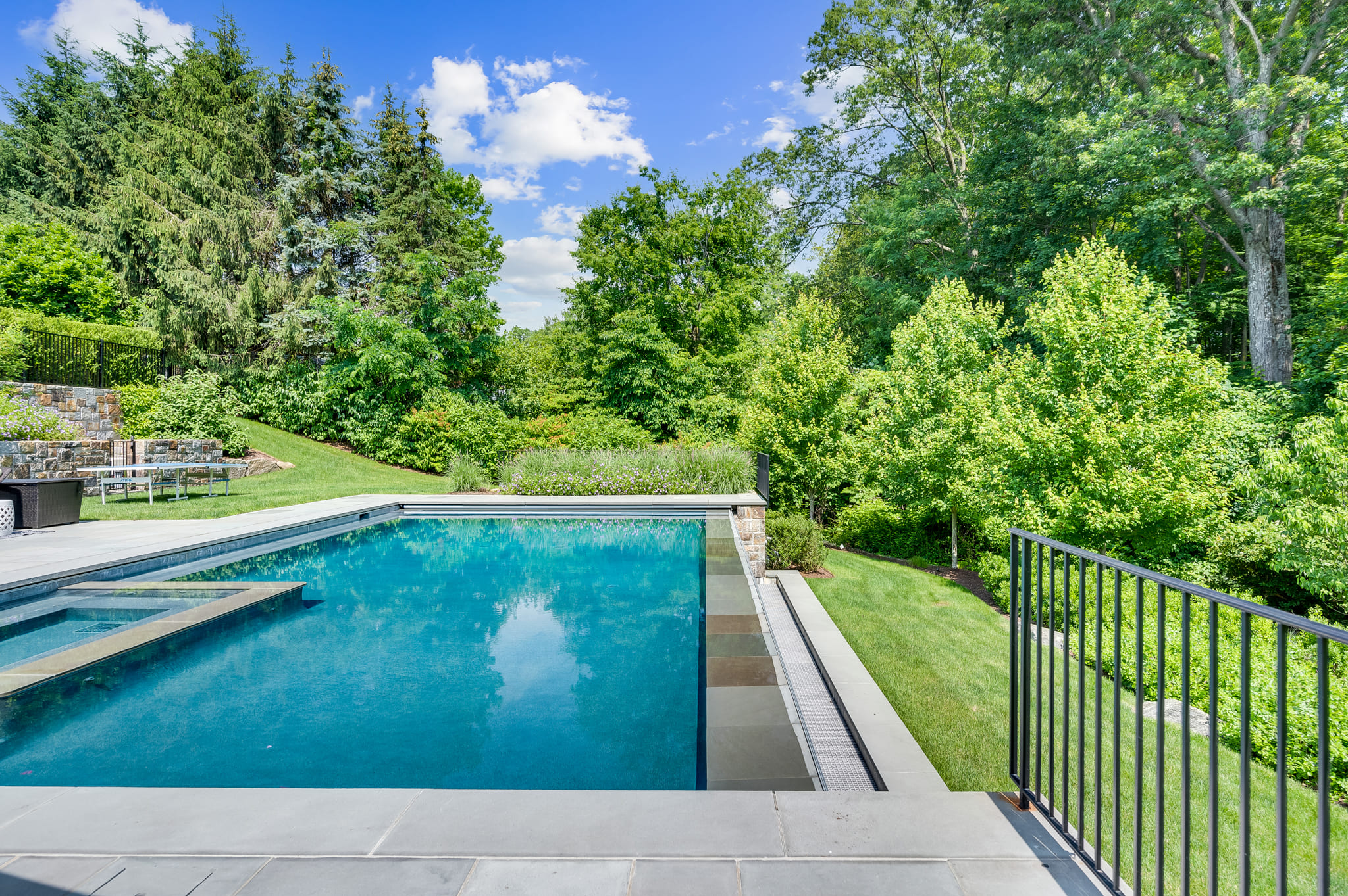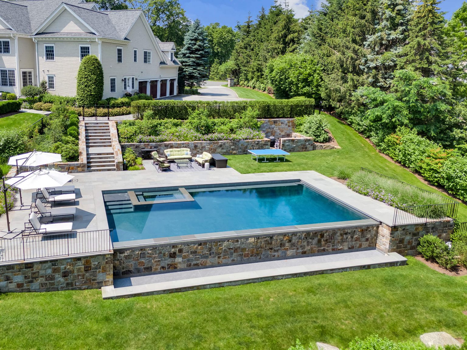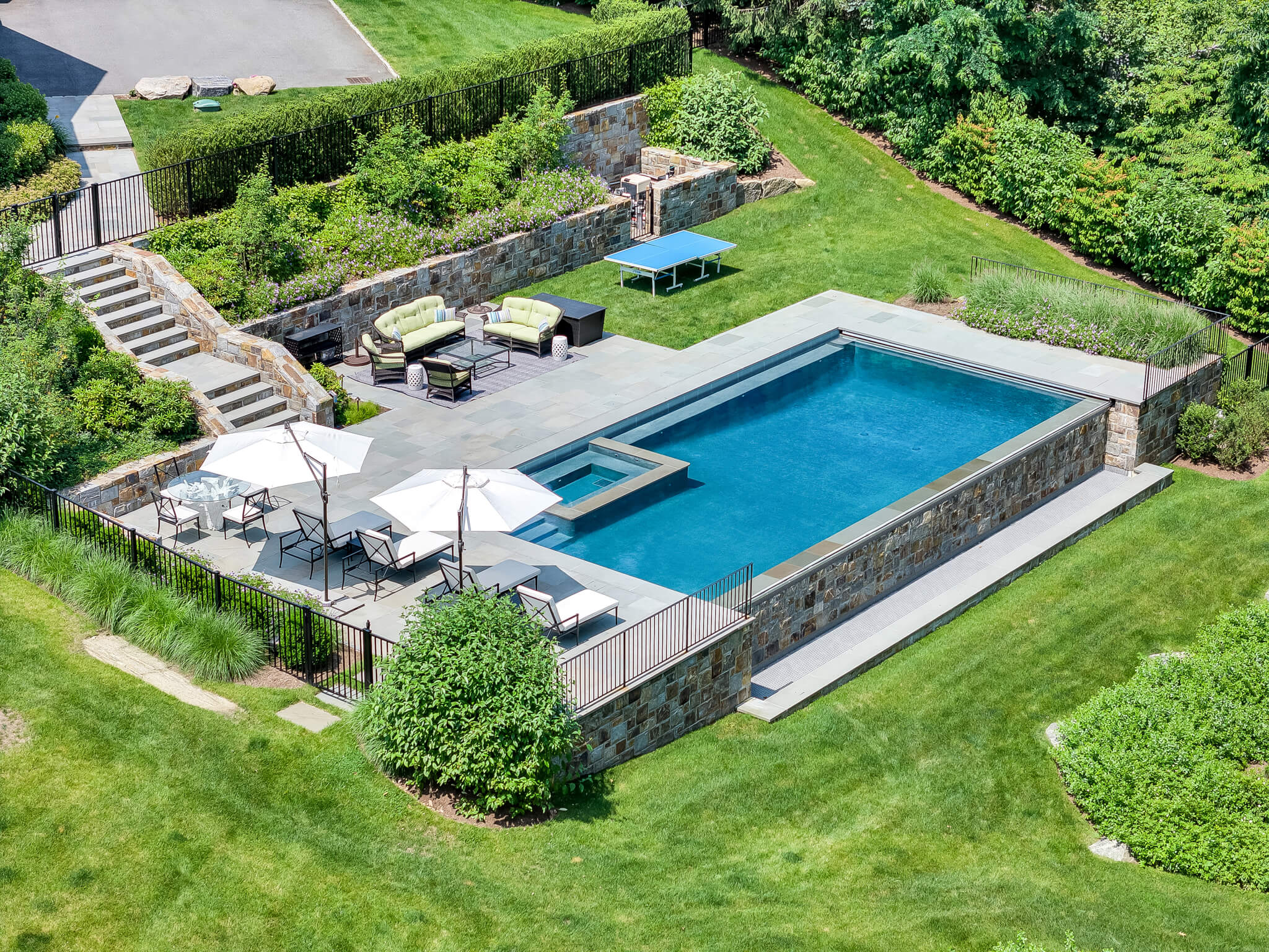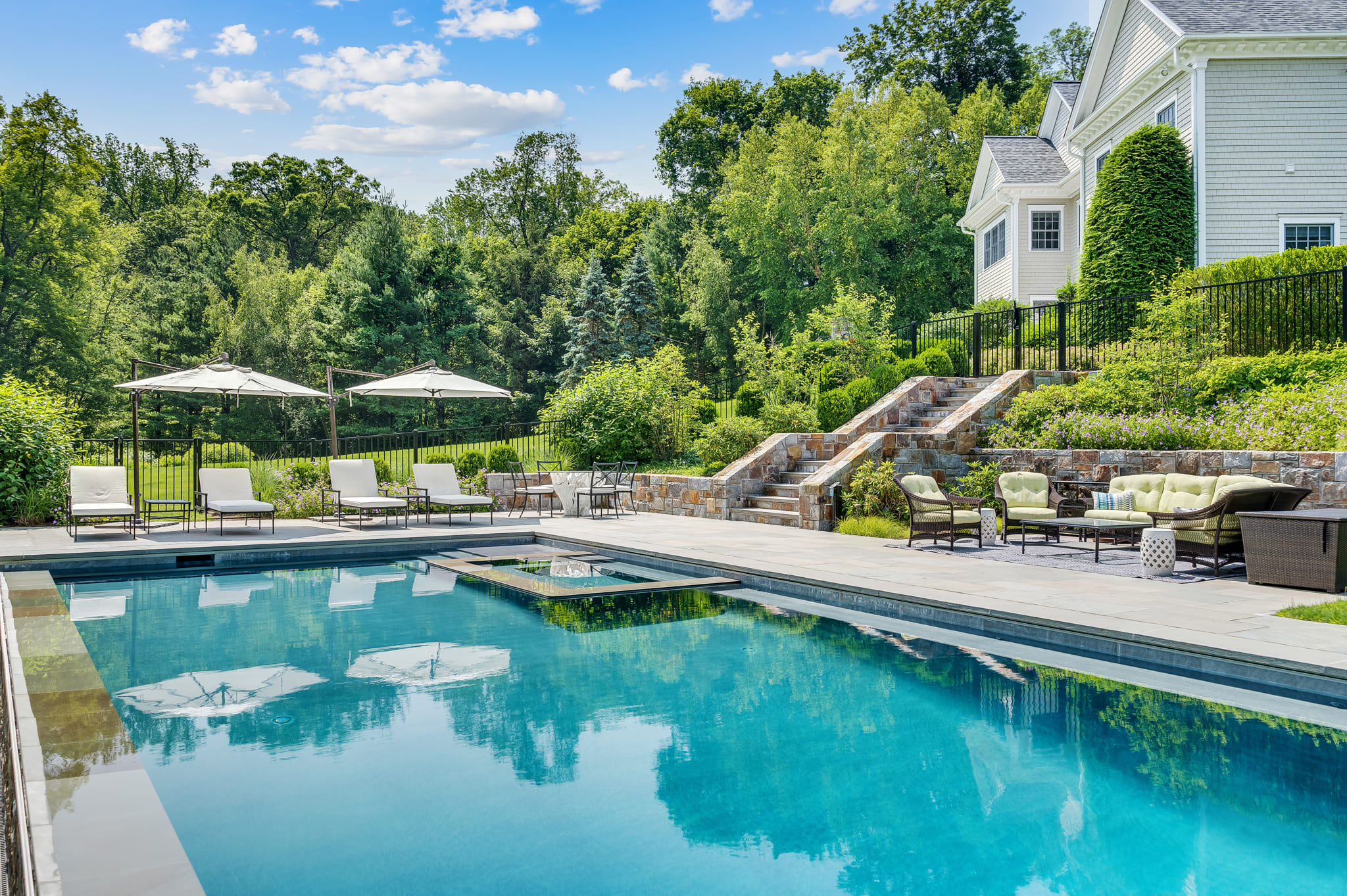 Nestled on a lush, sloping lawn with serene water views, this refined retreat blends modern pool design with timeless elegance. The geometric layout creates a striking focal point, anchored by a sparkling pool that flows seamlessly into a raised spa. Expansive stone decking offers ample space for lounging under the shade of umbrellas, while a sleek slide adds a playful touch for lively afternoons. Elevated terraces and manicured hedges frame the scene, enhancing both privacy and beauty. Just beyond, the tranquil river offers a picturesque backdrop, turning every swim into a moment of pure escape. Designed by Shoreline Pools, this outdoor living space invites both quiet mornings by the water and vibrant gatherings under the sun. With every detail considered, Shoreline Pools has created a setting where leisure and luxury meet in perfect balance.