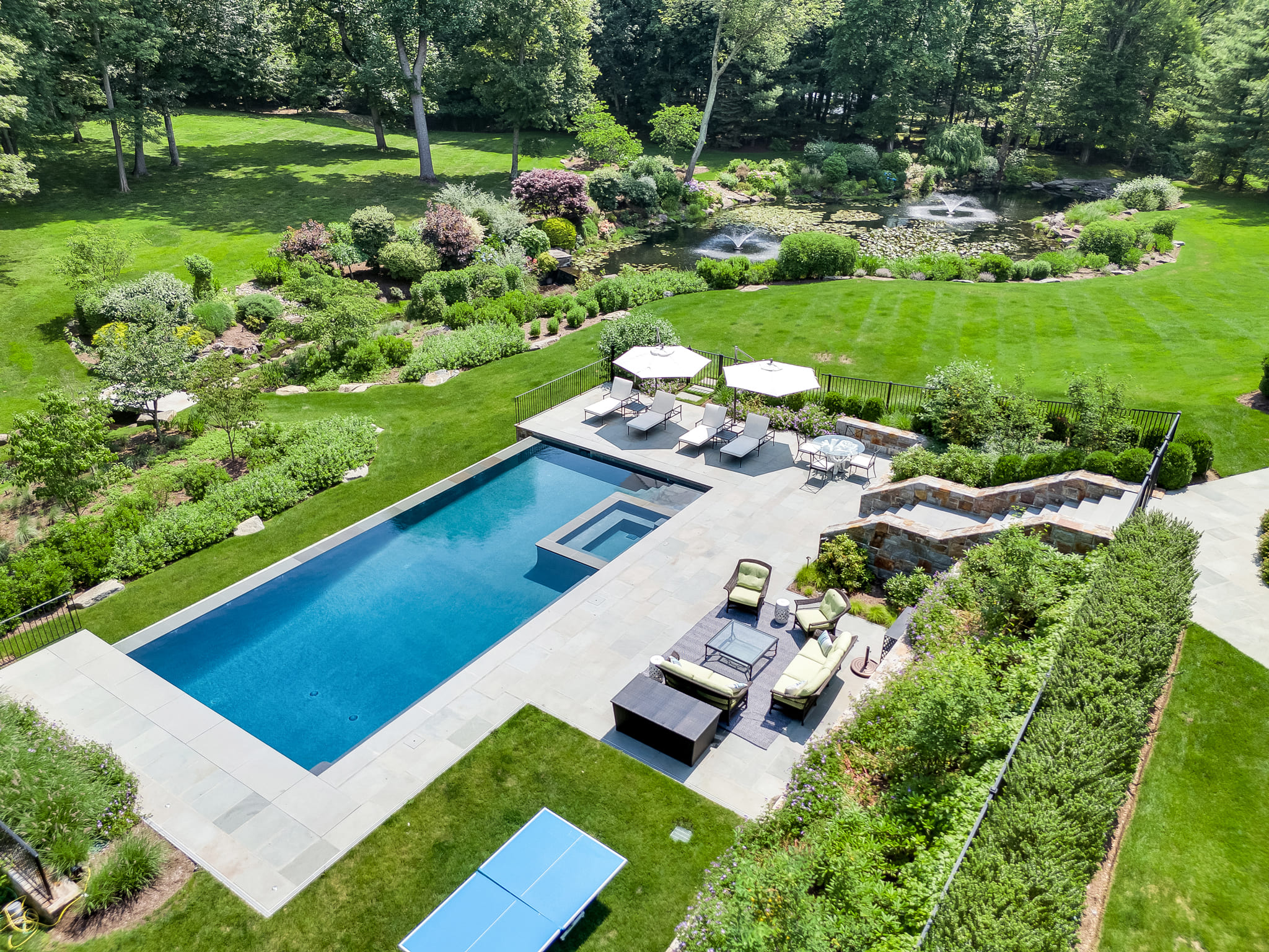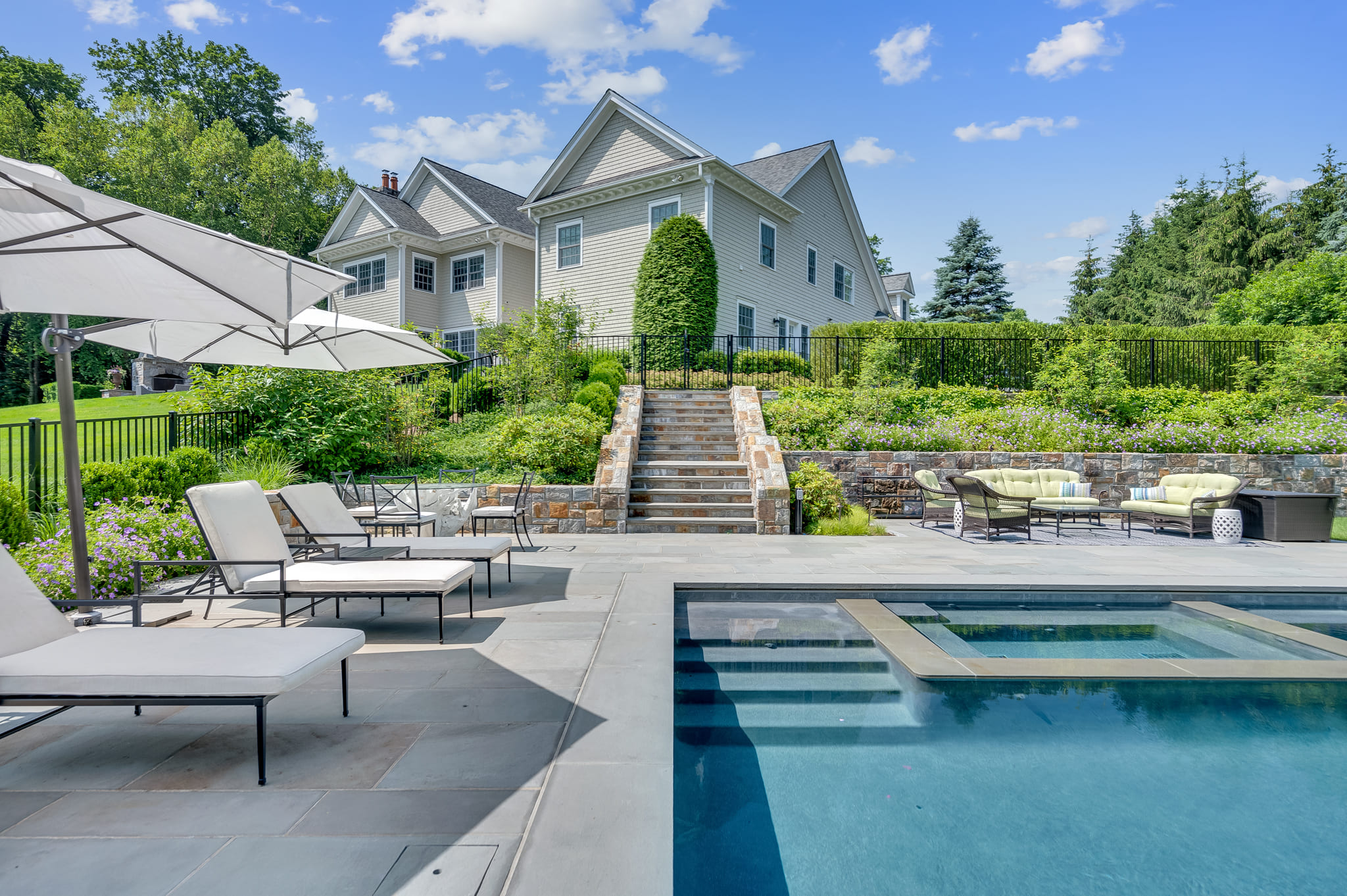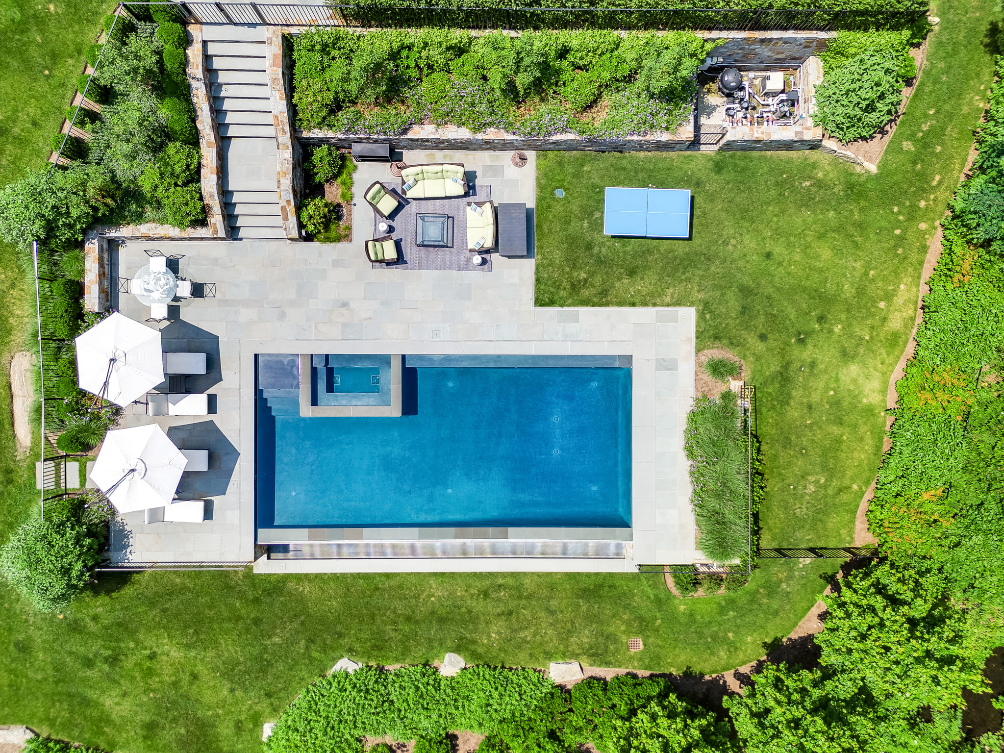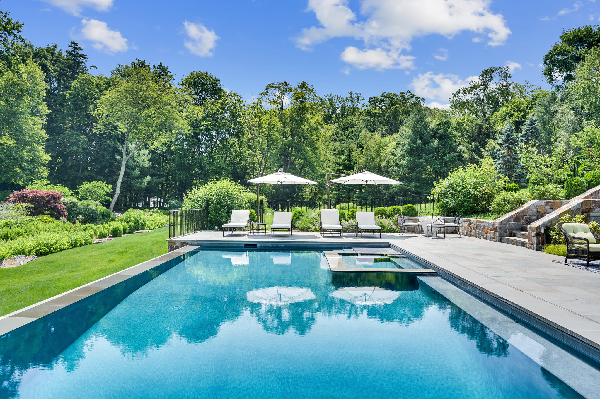 Nestled on a lush, sloping lawn with serene water views, this refined retreat blends modern pool design with timeless elegance. The geometric layout creates a striking focal point, anchored by a sparkling pool that flows seamlessly into a raised spa. Expansive stone decking offers ample space for lounging under the shade of umbrellas, while a sleek slide adds a playful touch for lively afternoons. Elevated terraces and manicured hedges frame the scene, enhancing both privacy and beauty. Just beyond, the tranquil river offers a picturesque backdrop, turning every swim into a moment of pure escape. Designed by Shoreline Pools, this outdoor living space invites both quiet mornings by the water and vibrant gatherings under the sun. With every detail considered, Shoreline Pools has created a setting where leisure and luxury meet in perfect balance.