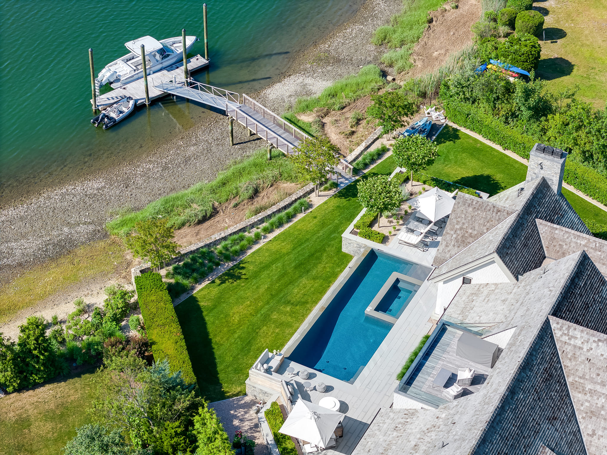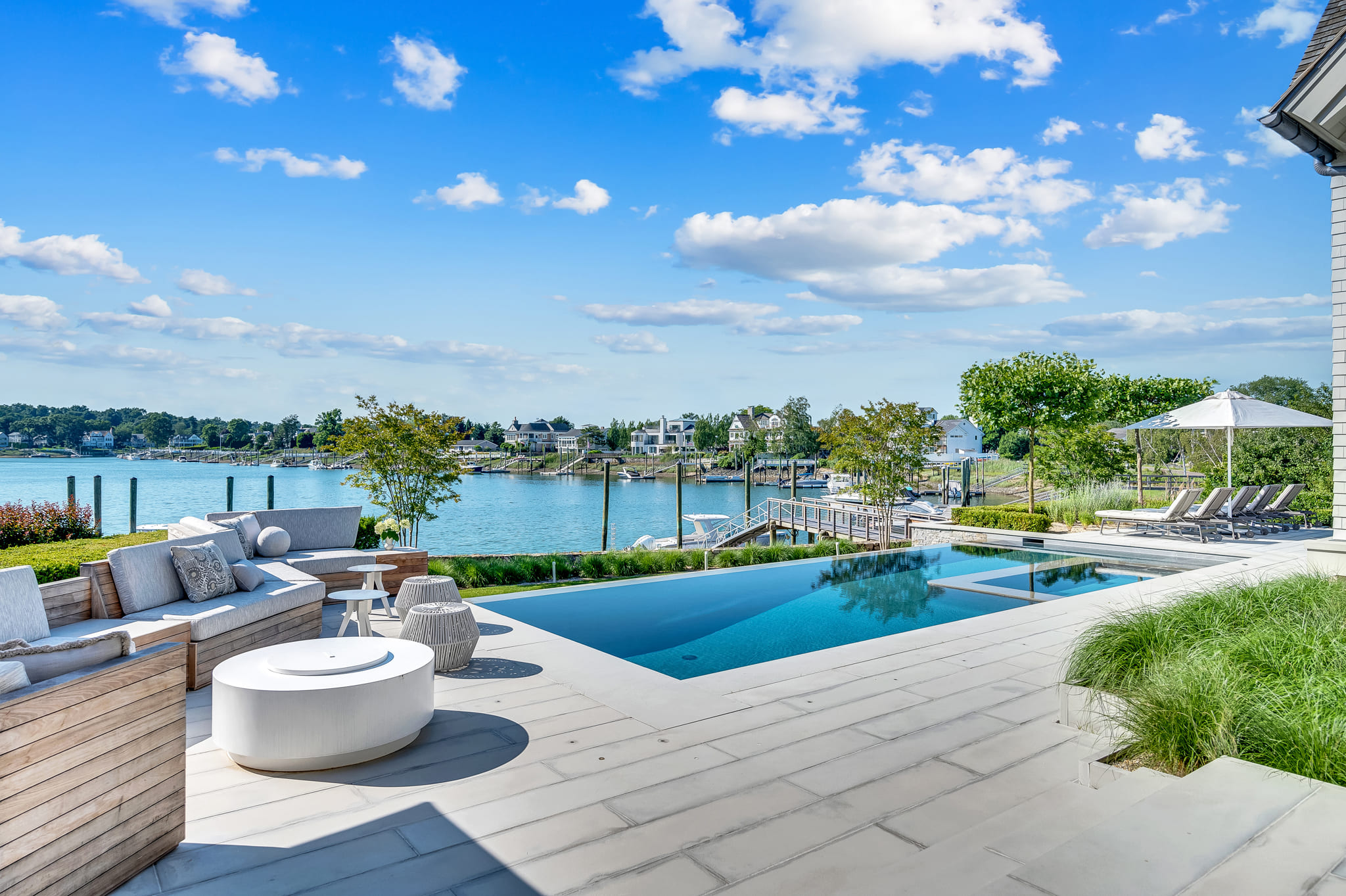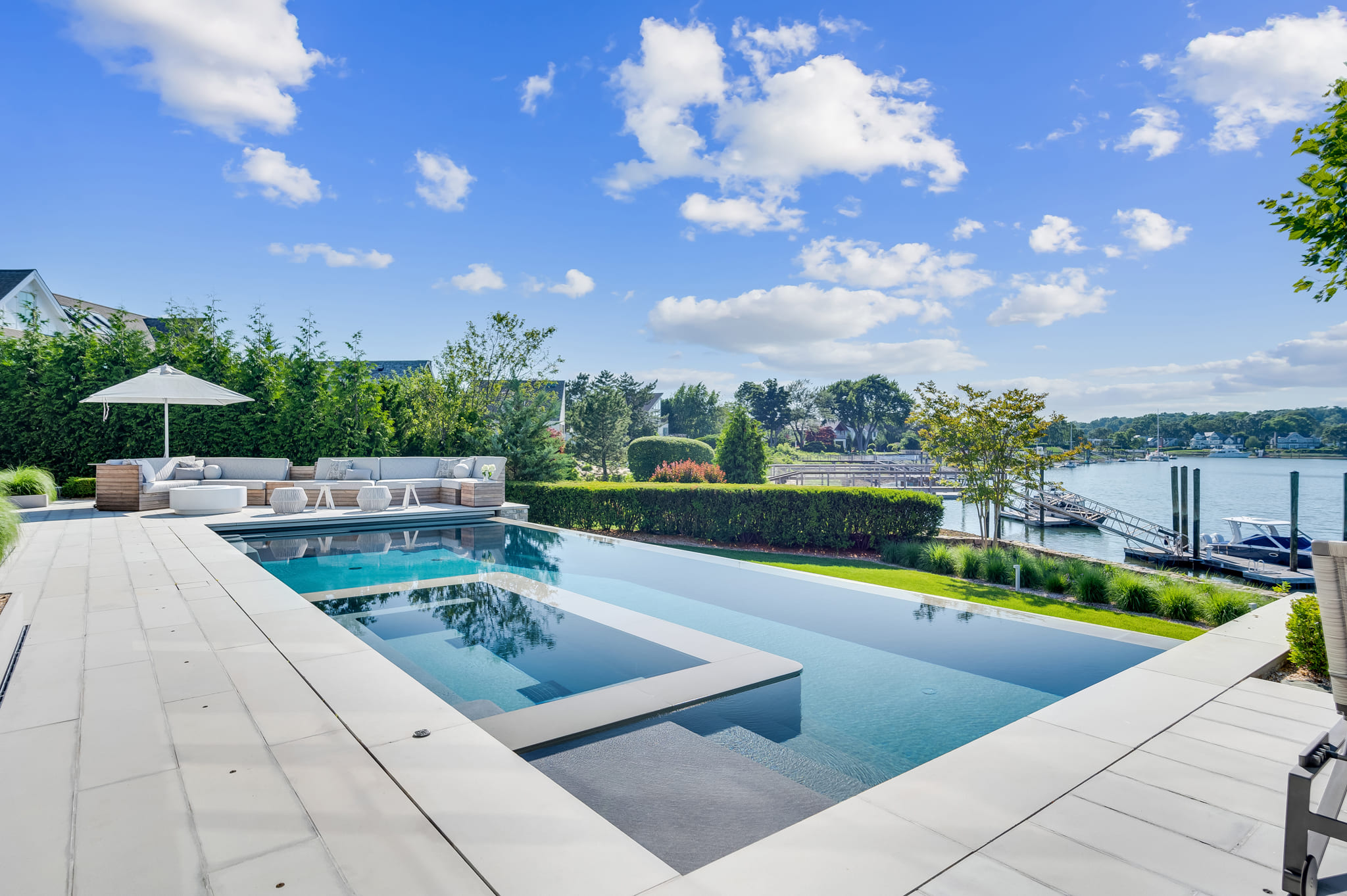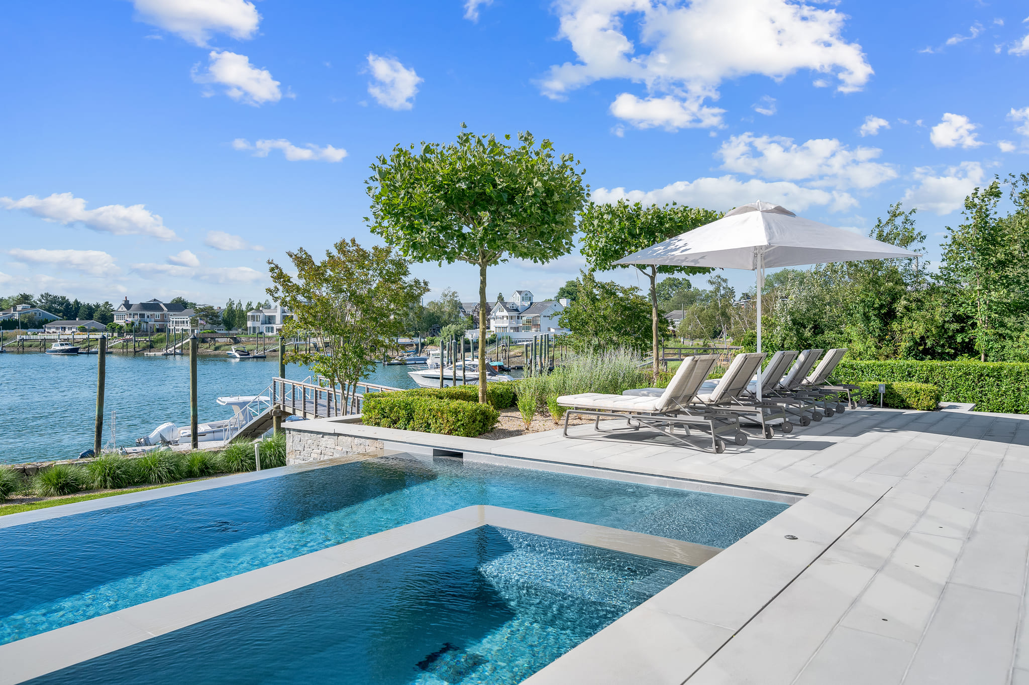 Framed by panoramic water views, this waterfront retreat blends modern pool design with the effortless rhythm of coastal living. The sleek, linear pool appears to spill into the horizon, creating a seamless connection between the property and the glittering expanse beyond. A built-in spa offers an intimate escape, while the expansive deck provides space for both sun-drenched lounging and shaded reprieve. The adjacent seating areas invite relaxed conversation as boats drift by in the distance. Every detail reflects the artistry of Shoreline Pools, from the clean geometry of the waterline to the thoughtful flow between pool and dock. This project demonstrates how a custom pool builder can create more than just a backyard; it delivers an outdoor living space that feels like an everyday vacation. With Shoreline Pools, elegance meets the water’s edge in perfect harmony.