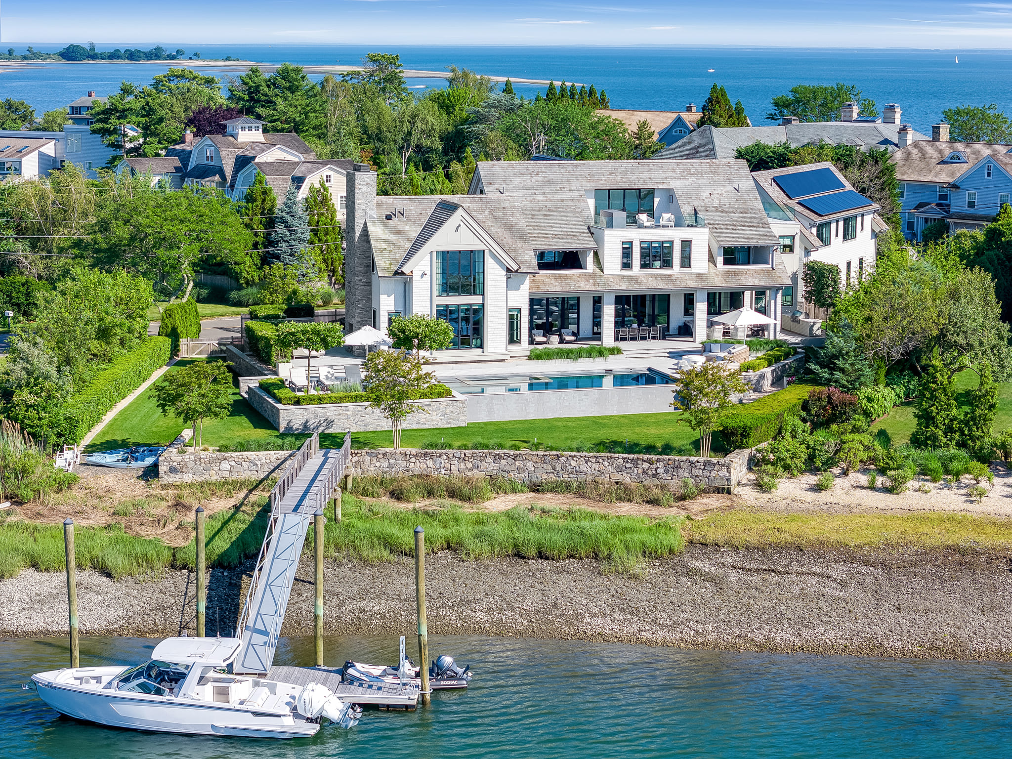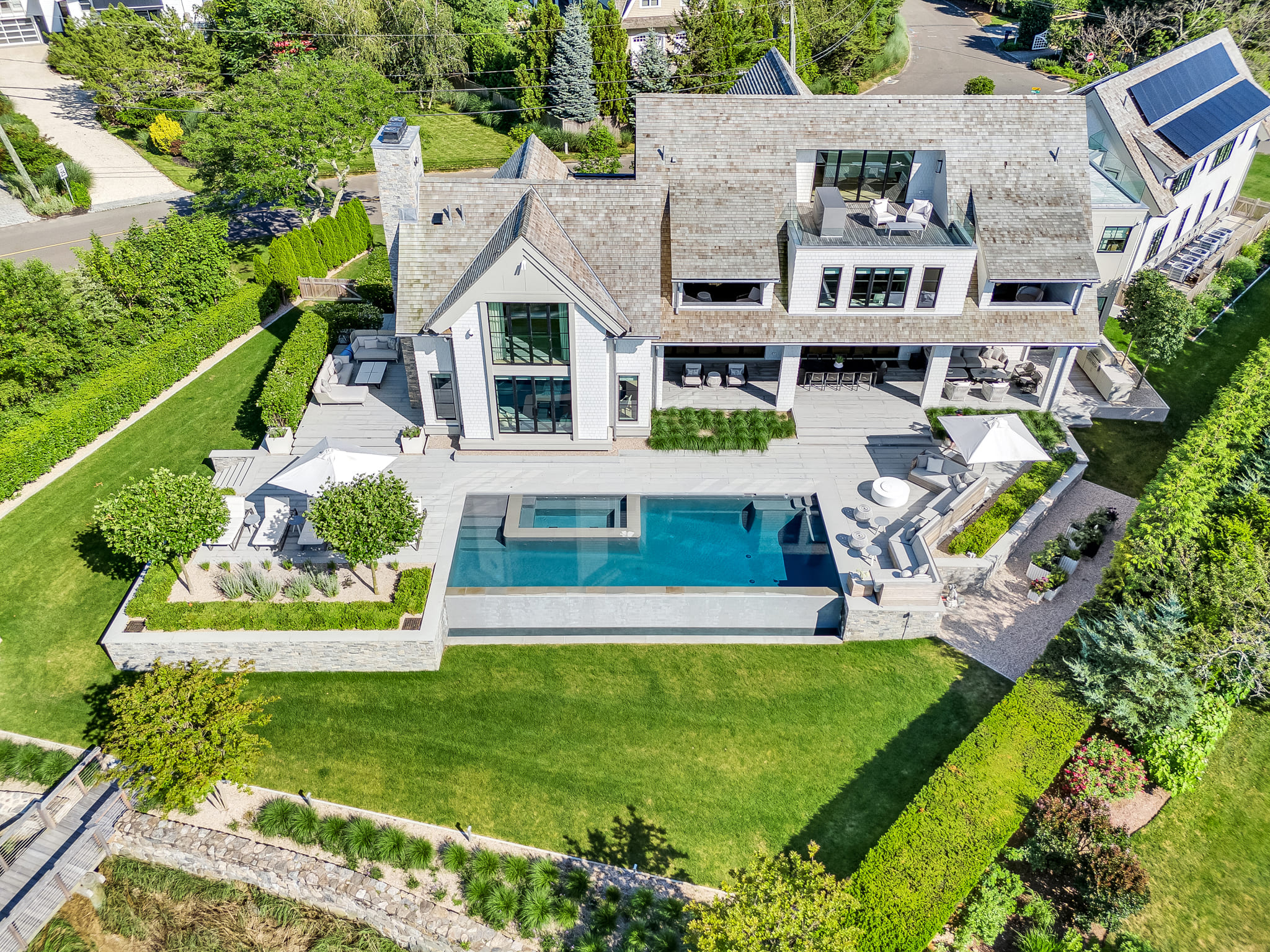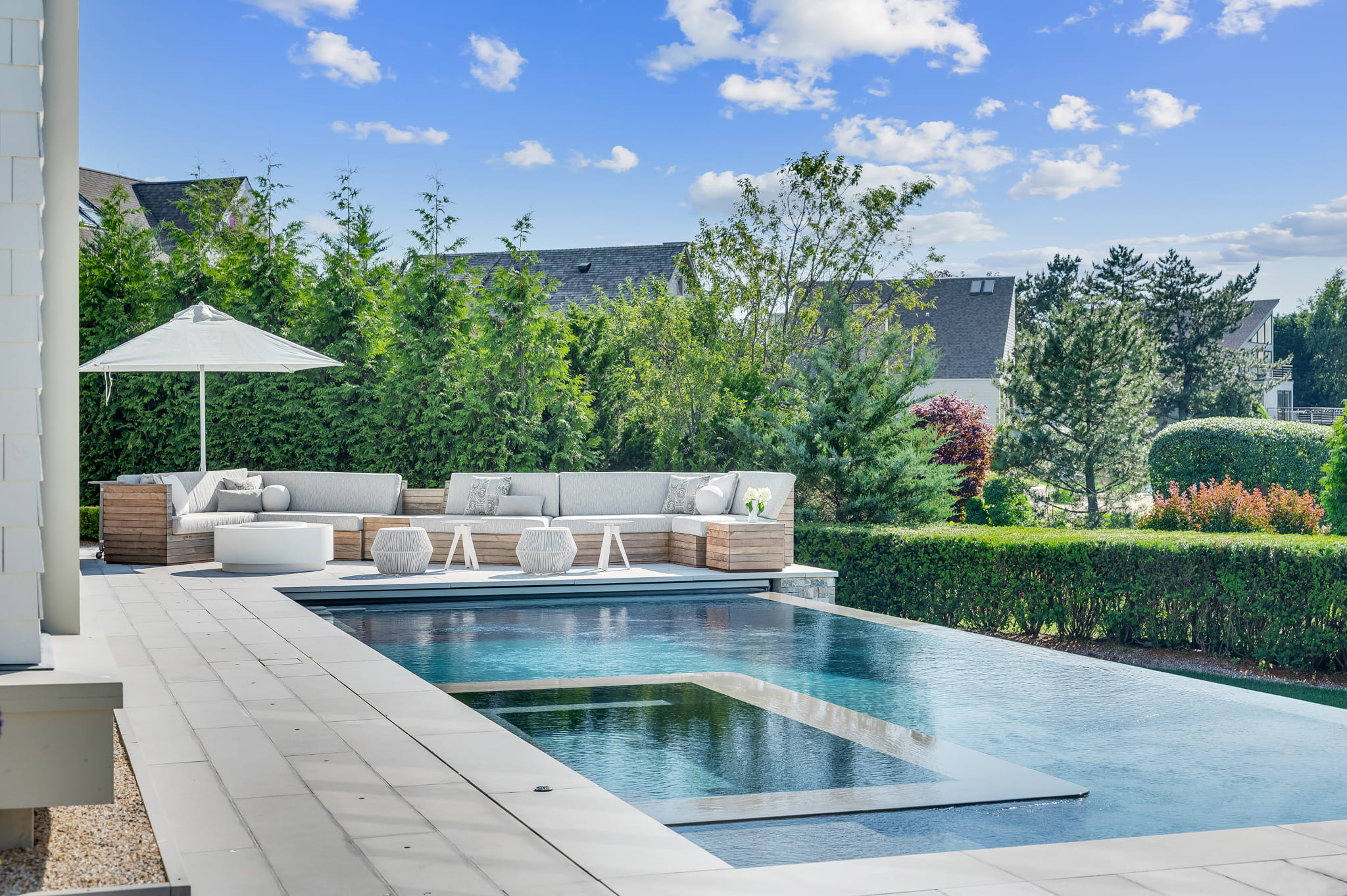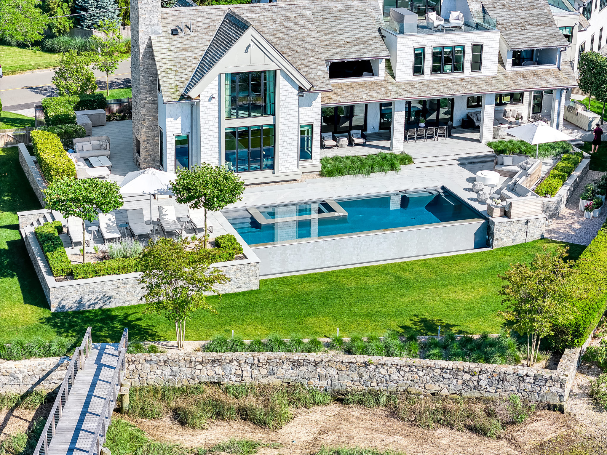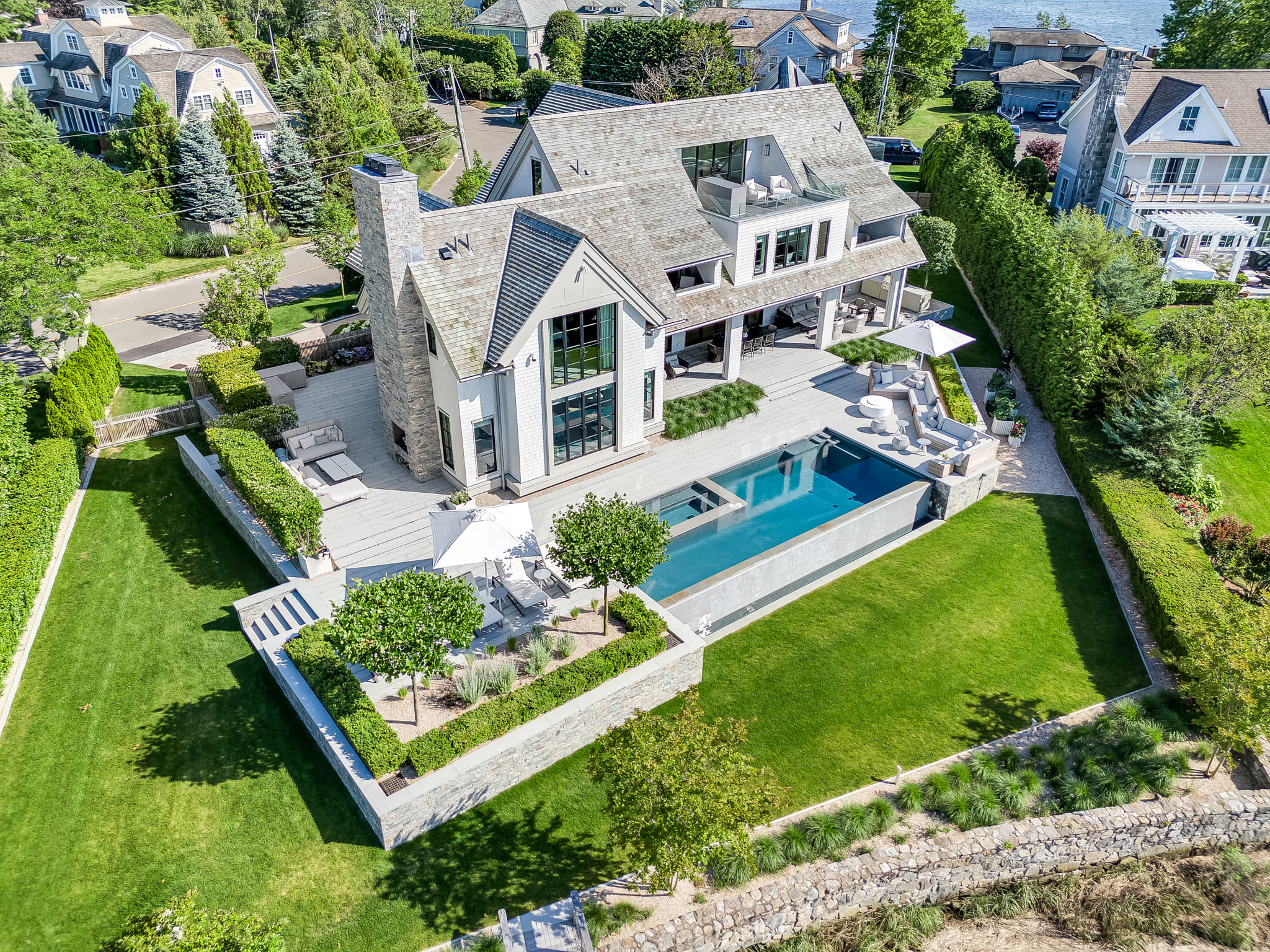 Framed by panoramic water views, this waterfront retreat blends modern pool design with the effortless rhythm of coastal living. The sleek, linear pool appears to spill into the horizon, creating a seamless connection between the property and the glittering expanse beyond. A built-in spa offers an intimate escape, while the expansive deck provides space for both sun-drenched lounging and shaded reprieve. The adjacent seating areas invite relaxed conversation as boats drift by in the distance. Every detail reflects the artistry of Shoreline Pools, from the clean geometry of the waterline to the thoughtful flow between pool and dock. This project demonstrates how a custom pool builder can create more than just a backyard; it delivers an outdoor living space that feels like an everyday vacation. With Shoreline Pools, elegance meets the water’s edge in perfect harmony.